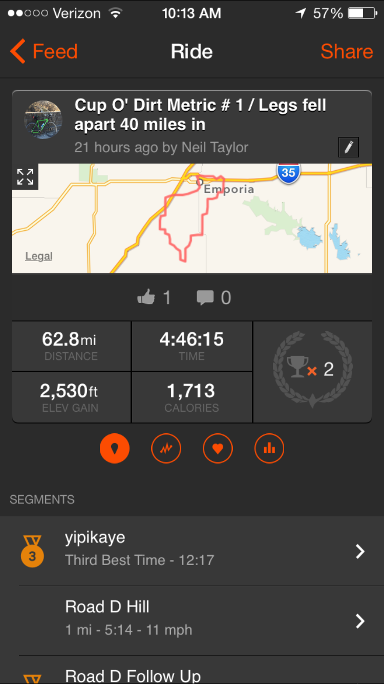 “Finished my first official 100k this year. I had a 97 k back on January 19th before I found out about this challenge. Today I rode out into that flint hills south of emporia, KS into about a 15mph wind. I wanted to get the wind out of the way to start off the ride and then have it at my back to bring me into town. The early climbs were all very familiar to me. I’ve rode those before, but this was my first ride of any distance in a while so I took it easy. Been fighting a mix of colds & sleepless night due to an infant with ear infections. Most rides have come in at 25 miles recently. As I headed further south I turned onto a stretch of rode I hadn’t been on before. I didn’t have a planned route so I headed down G road. Up ahead I saw a decent hill and I was getting really sick of riding hills into this southern wind, but I saw a rode right before the hill and figured I would turn. Crap!! it was a dead end. So I went back and rode up the hill. It about killed me, but this was the southern point of my ride. From here I was heading a mile over and then going back north. North = wind at my back = rest for my legs.