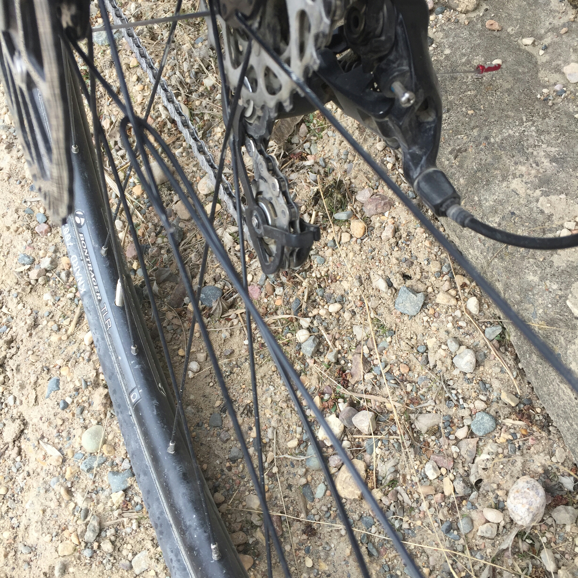 At around the 20 mile mark, I heard a loud ping come from my back wheel, and assumed I had thrown a rock into it. It wasn’t until mile 30, after a brief stop to fiddle with my Garmin, that I realized I had broken a spoke. I didn’t have any experience with this situation, but have seen a couple YouTube videos. First step, secure the spoke. Check. Second step, adjust corresponding spokes to straighten wheel. No spoke wrench. Check. I figured a wobbly wheel wouldn’t make that big of a difference, since I was running disk brakes. Heck, I didn’t even notice it the last 10 miles. I decided to push on.