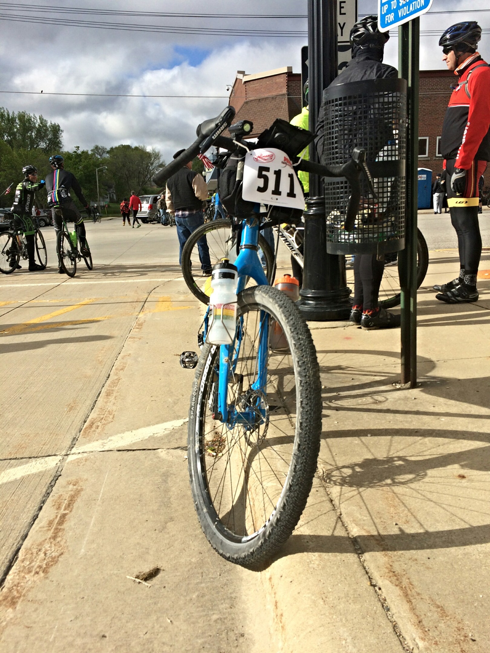 “Got up early and drove up to Spring Valley, Minnesota for the Almonzo 100. Arrived at about 0800 and found a parking place between the Start and Finish lines. Rode over and got my number and a few stickers and went back to prepare the bike and gear for the ride. As we were assembling at the Starting Line, I ran into Marty; we took a picture with our matching Bomb-Pop Blue Fargos. The race started at 0900 and we rolled out of town to the North and then East enjoying a nice tailwind. The temps were in the 30s, and the riding was pretty easy for the first half of the race.