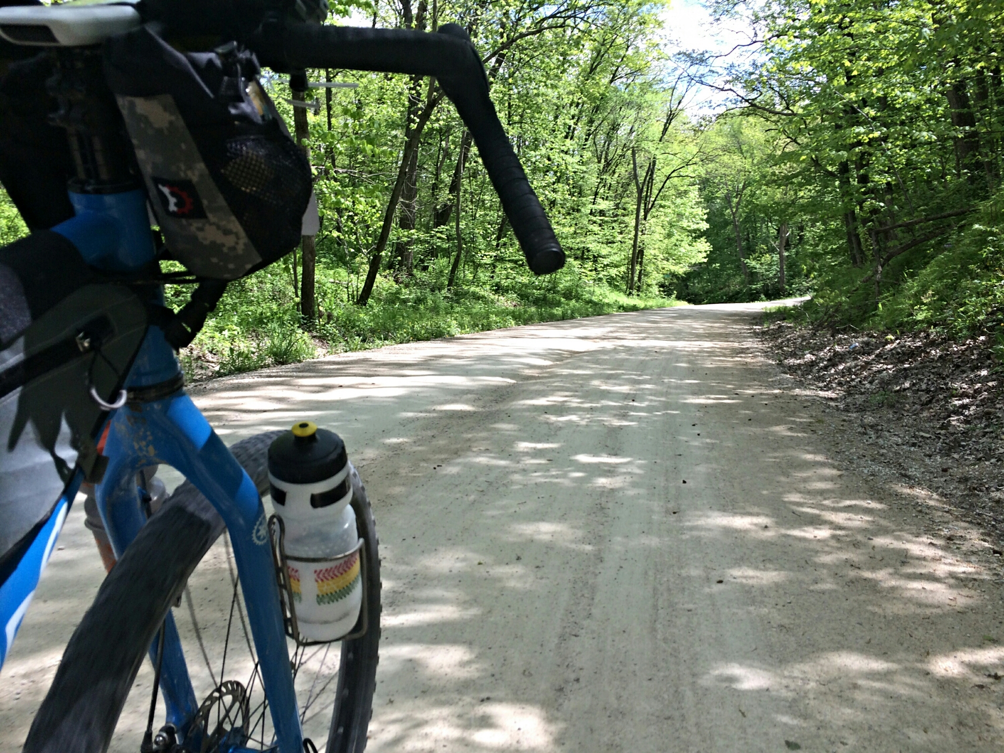 As I approached Cherry Grove, I remembered that the Riding Gravel crew was going to be there this year. Mark and Jake were standing on the corner ringing the cowbell and Jake brought me some bacon. I ate some more bacon as well as a few pieces of watermelon. I was hoping to beat my time from the two previous years, but I realized that it wasn’t going to happen. The wind was too strong and I was riding into it whether I was going North or West, which was the general direction of the rest of the course. The water crossing was bone dry and I was able to ride through it instead of carrying the bike. I was feeling pretty good when I reached Oriole Hill and the road was in excellent shape for a change. I shifted into granny gear and ground my way to the top. I had less than 10 miles to go and I knew that there was only one more significant hill to go. I rode down into the last deep valley and thought about stopping to take a picture against the cliff, but I was hoping to beat 9 hours so I kept pedaling.