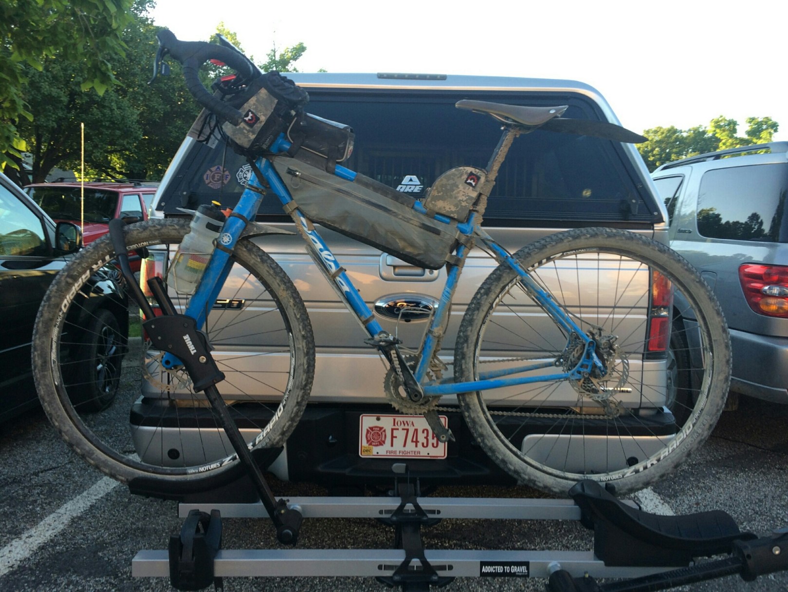 “Guitar Ted and I drove down to Emporia, Kansas on Thursday. GT wasn’t racing, but he wanted to see everyone and hand out Riding Gravel stickers. He had printed out maps of the area and was going to do a ride-about away from the course; I’m sure he will submit his CO’D metric century soon. We stayed in a dorm room at the college; the AC wasn’t working and the building was hot and stuffy. We went for a short ride Friday morning until GT had a major blowout on his rear tire and we had to limp it back to town. We spent the rest of the day getting registered, going to the rider meeting, and getting new tires on GT’s bike. The weather was looking perfect for Saturday, until the forecast changed and they were predicting rain at night and up to 20 mph NW winds all day Saturday. We woke up at 0400 and headed to breakfast at the cafeteria before heading down to the starting line. It had rained, but everything in town was drying up. GT hung out with me at the starting line until we left at 0600. As we turned on to the first gravel road at the edge of town, the entire road was flooded with 6 inches of water. By the time we rode through a few sections of flooded gravel, we had passed several hundred riders on the side of the road with various degrees of mechanical problems. I saw more than one derailleur hanging from the bike. I wasn’t trying to win the race, so I just gingerly pedaled my way through the water and tried not to force anything. Within a few more miles we were on dry roads, but I could tell that all of my chain lube had washed out of the chain. I didn’t bring any extra lube, so I just kept pedaling. The wind was out of the West and the course was typical Flint Hills two-track. There were rough sections where I was riding my bike faster than I would ever drive my 4X4 pick-up. I rode past a bike wreck with several people attending to an injured rider; he appeared to be in pretty bad shape. Several emergency vehicles responded and we all stopped and pulled off of the road so they could get by. At the first river crossing, I saw everyone carrying their bike, but it only appeared to be ankle-deep, so I attempted to ride through it. Everything was going good until I hit the main channel on the far bank and hit a knee-deep hole. It probably washed a pound of mud and rock off of my bike, but I doubt if it did my bottom bracket or wheel bearings any good. We were heading mostly SE towards Madison by this time and the tailwind was making for a pretty easy ride. Every now and then I could hear Bobwhite Quail calling in the pastures and creek bottoms along the course; I heard quail off and on all day except when the wind was whistling past my ears. I saw several little turtles sitting in the middle of the road with their head and feet tucked into their shell. Rolled into Madison and found the Never Let Go Crew-for-Hire tent in the high school parking lot. Filled up my Camelbak, cleaned my sunglasses, and added a few pumps of air in my front tire. Pedaled out of Madison and headed into the west wind again before swinging to the SE towards Eureka. The scenery in this area was spectacular; grass and rock for as far as you could see. There were a few roadkill armadillos, and I was hoping to see a live one before the end of the race. The tailwind was awesome and I made Eureka in a little over 7 ½ hours. I was in good shape and I didn’t spend too long before heading out again. We rode South and East for quite a ways before turning north. The wind was mostly out of the NW and it had picked up considerably. This was the longest section between checkpoints, and it was getting hot. The wind was taxing, and I was going through a lot of water as I ground into the wind. I was hot, dry, and tired when I arrived at the last checkpoint. I was hungry, but my gut wouldn’t let me eat a lot. I spent a lot of time walking around and hydrating before I topped off my water and headed out for the last leg of the race. My chain had been noisy since mile 30, but it was really raising hell now and I thought it was going to break at any minute. I tried to keep the chainline as straight as possible and use easy gears, but the chain popped and groaned as I pedaled. As the sun set, I stopped and took a picture of the horizon.