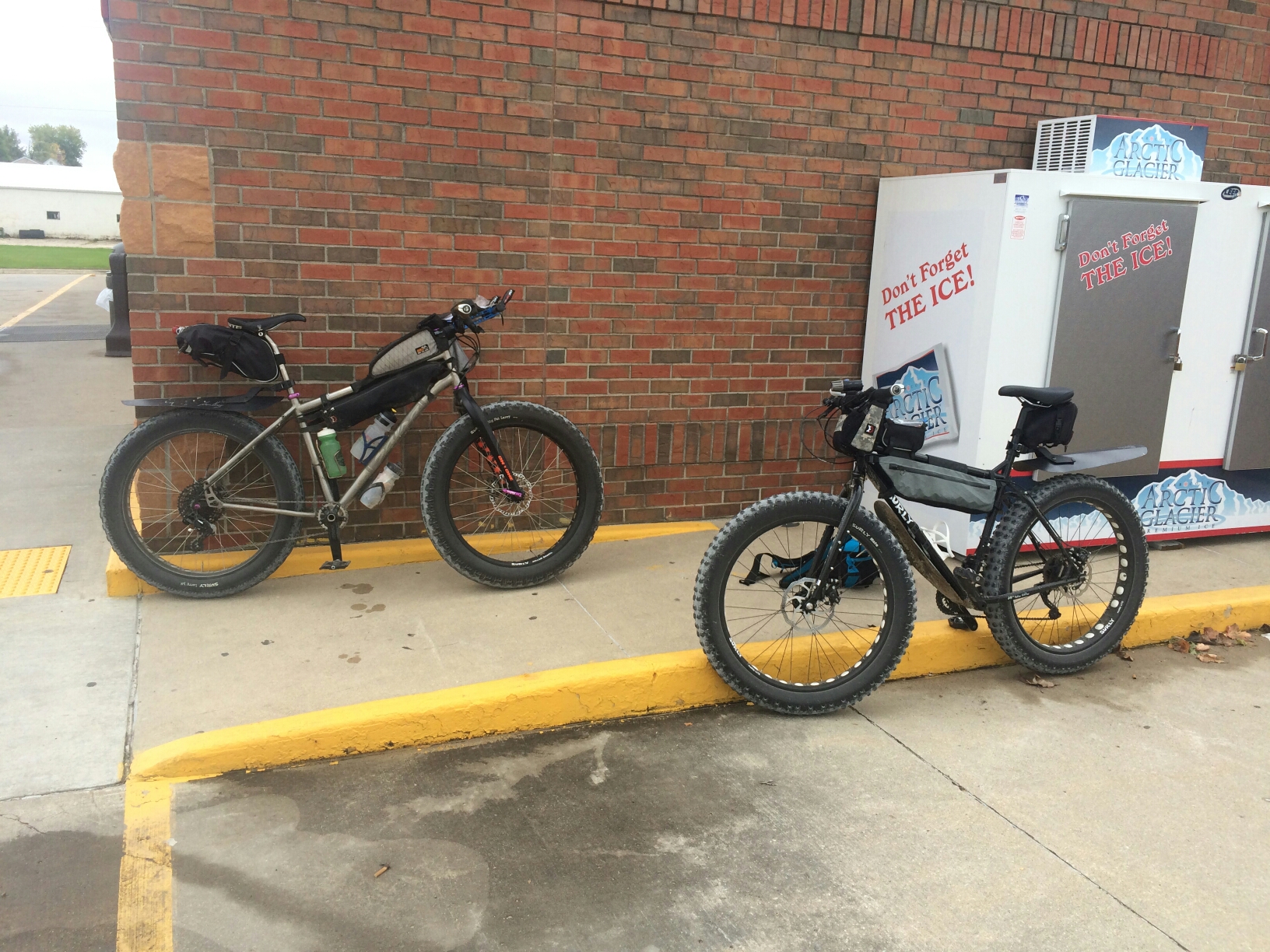 “Dirty Century #6. I mentioned to GT that I wanted to do my 6th gravel 100 mile ride on my Surly Pugsley, and he thought that he would like to ride along on his Ti Mukluk. My original plan was to follow the Shell Rock River up to Greene, IA and then South towards Parkersburg, but there was a thunderstorm in the Greene area that week, and several of the roads had been washed out in the flood after the storm. I then decided to follow the route that I had taken to Eldora last year when I rode over to camp the night before riding back with RAGBRAI. I had to work at the fire station the night before, so I didn’t get home from work until after 0800 that morning. It was raining when I texted GT that I was running late, so I would meet him at Byrnes Park instead of the Kwik Star; the rain slacked off to a drizzle by the time I arrived at 0900. We headed out of town on the bike path and we were so busy talking that we missed our first turn. We were able to get back on track via another bike path and we headed West on Ranchero Road for several miles. The drizzle had stopped and the temps were comfortable, so we peeled off our jackets. We rolled through Dike and continued West towards Wellsburg. We stopped at Casey’s in Wellsburg and topped off our water before continuing towards Eldora. The sky was ugly, but the wind wasn’t bad and the temps were saying cool because of the cloud cover. The gravel was in good shape and there were not a lot of hills through this section of the ride. We rolled into Eldora and stopped to use the facilities at the park. One of the locals stopped to remark about the tires on our bikes, and he tried to talk us into visiting the museum while we were in town. We didn’t make any other stops in Eldora and we headed North out of town on the same route that we used on the GTDRI in July. As we rolled down the hill into the Iowa River valley, I noticed that GTs bike was coasting as fast as I could pedal downhill. He was running Surly Big Fat Larrys on his bike while I had the original Nates on my Pugsley. This section of our route had a few steep hills, but it flattened out as we headed East towards Ackley. We skirted the south side of Ackley and continued East. We were paralleling old Hwy 20, so we passed within a mile of Aplington and Parkersburg. We had not stopped to resupply since Wellsburg, and I ran out of water somewhere between Aplington and Parkersburg. We should have ridden into P’burg, but we knew that there was a Casey’s on the route near New Hartford which was about 10 miles away. As we neared New Hartford, I could feel the bonk coming on. I was having a hard time keeping up with GT, and I was kicking myself for not going out of our way and riding into Parkersburg for food and water. We rolled into Casey’s and I bought a quart of chocolate milk and some chicken fingers.